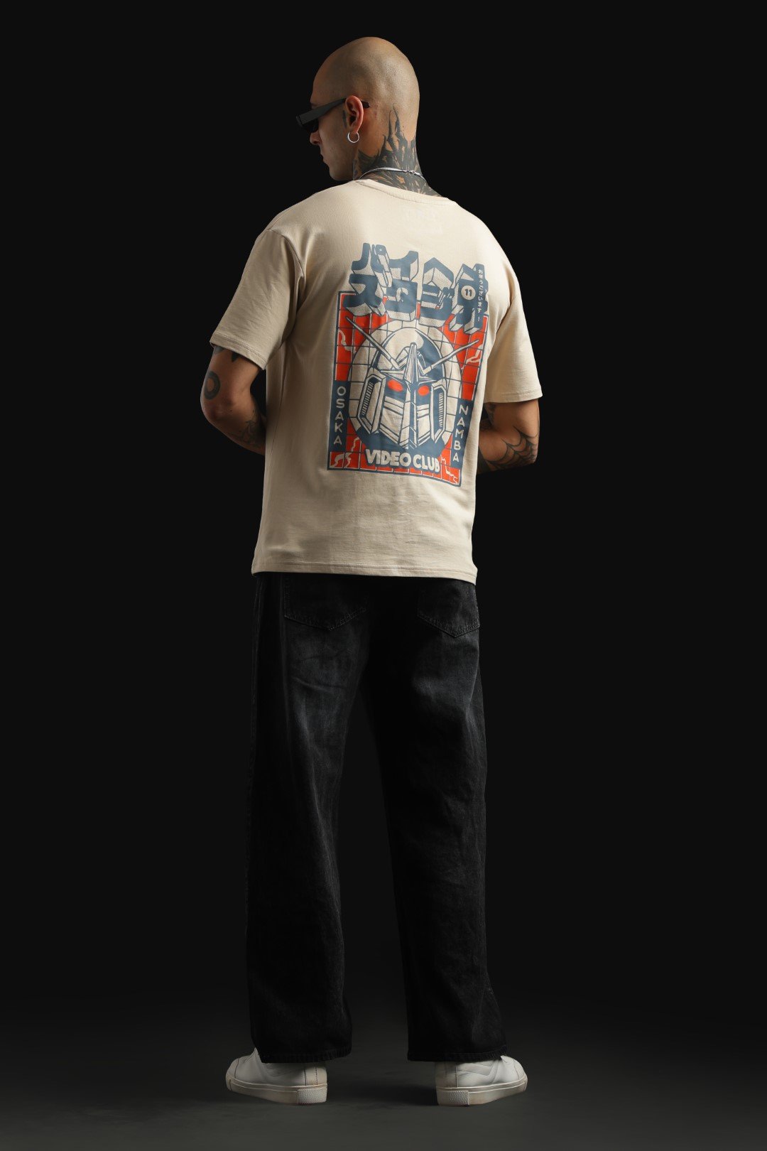 Step into retro Japanese streetwear style with the Transformer OSAKA – NAMBA Video Club Oversized Beige T-shirt. Made from soft, high-quality cotton for all-day comfort, this relaxed-fit tee features a striking back graphic inspired by vintage anime and Japanese video club culture. The design centers on a detailed mecha or robot head reminiscent of a Gundam unit, with glowing red eyes that command attention. Large Japanese characters adorn the top of the graphic, while ‘VIDEO CLUB’ is prominently displayed at the bottom. The words ‘OSAKA’ and ‘NAMBA’ run vertically along the left and right edges of the artwork, completing the vintage, poster-inspired aesthetic. Printed in dark blue/black, red/orange, and white/cream tones, this T-shirt merges retro Japanese visuals with modern streetwear style. Ideal for anime fans, mecha enthusiasts, or anyone looking to make a bold statement with a unique, culturally-inspired graphic tee.